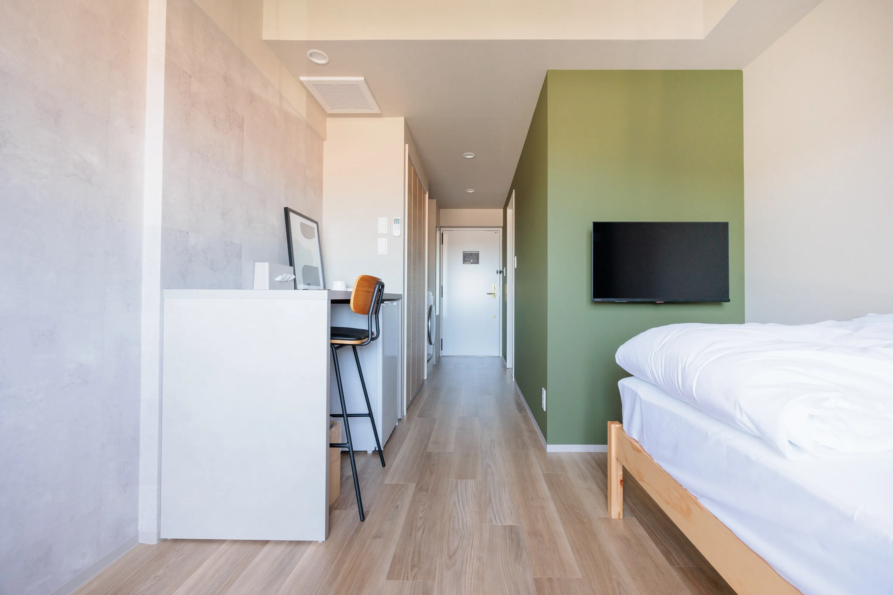 ワンランク上の上質な滞在を。 広々とした個室、落ち着いたラウンジ、充実した設備が、心地よいひとときを演出します。 忙しいビジネスシーンでも、ゆったりとした時間をお過ごしいただけます。全部屋洗濯乾燥機を完備しており、無料でご利用いただけます。